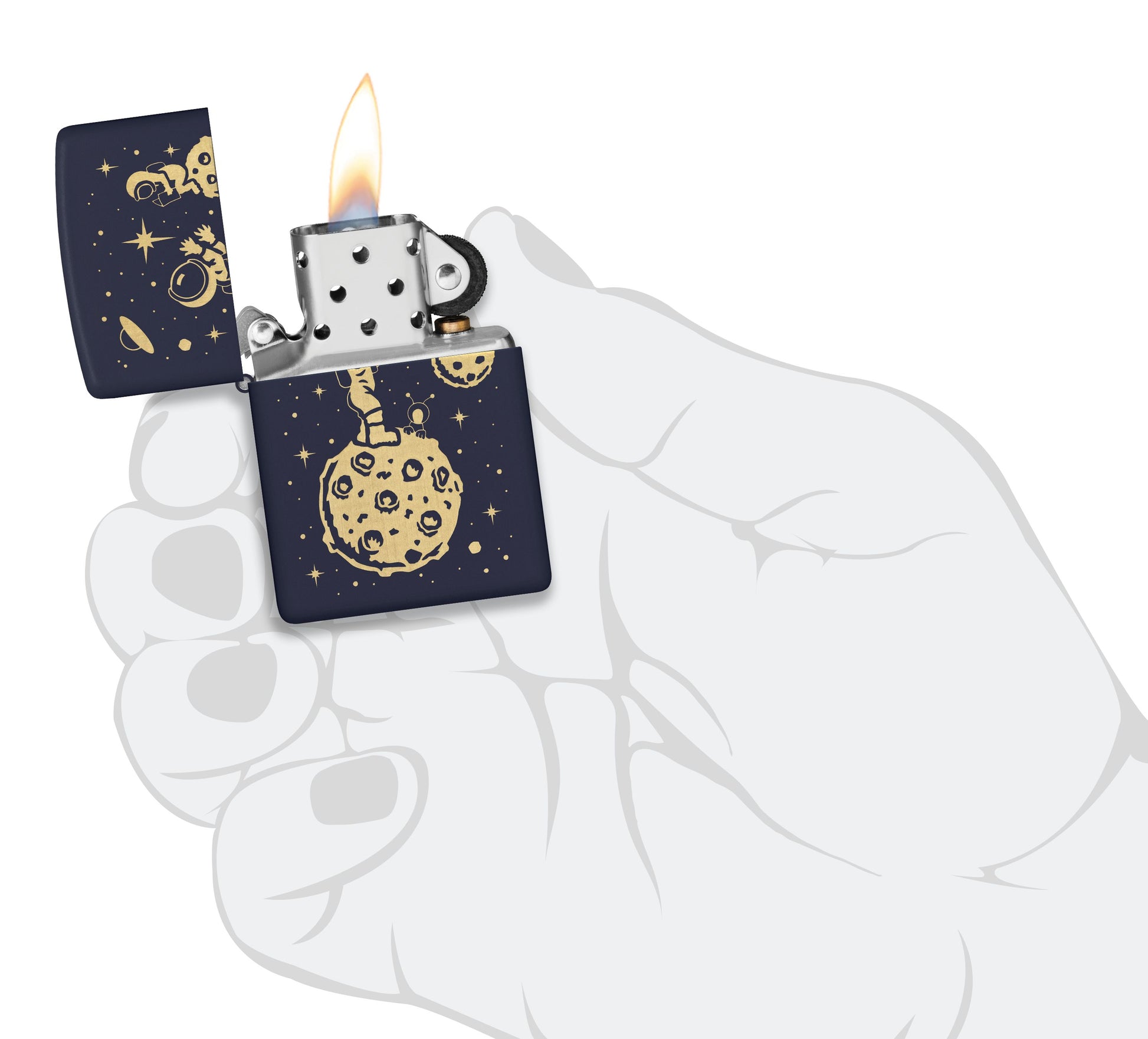 Класична бензинова вітрозахисна запальничка Zippo 239 Space Men Design із зображенням астронавтів. а синьому покритті запальнички 239 моделі. Дана запальничка, втім, як і всі інші запальнички Zippo, відрізняється високою якістю. ВСІ запальнички Zippo в продаж надходять не заправленими. Паливо можна купити окремо.