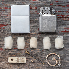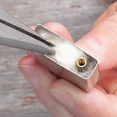 Спочатку видаліть усі компоненти з нижньої частини вставки запальнички: кременевий гвинт, фетрову прокладку, пакувальний матеріал та старий гніт.